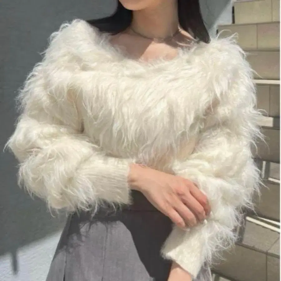 아이보리 색상의 퍼 느낌 오프숄더 스웨터, 볼륨 슬리브로 캐주얼한 인상을 줍니다.