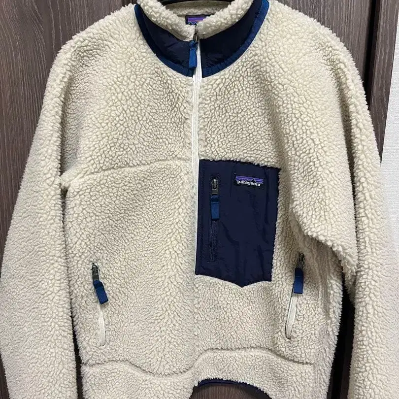 플리스 소재의 아이보리와 네이비 콤비네이션 자켓, 지퍼 포켓 부착으로 기능성도 발군.