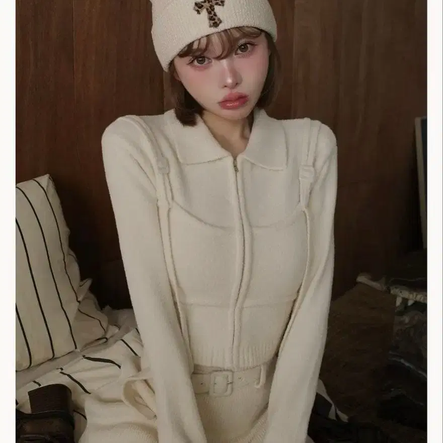 다리치의 뷔스티에 도킹 니트탑의 색상은 아이보리입니다. 1회 짧은 시간만 착용했습니다.