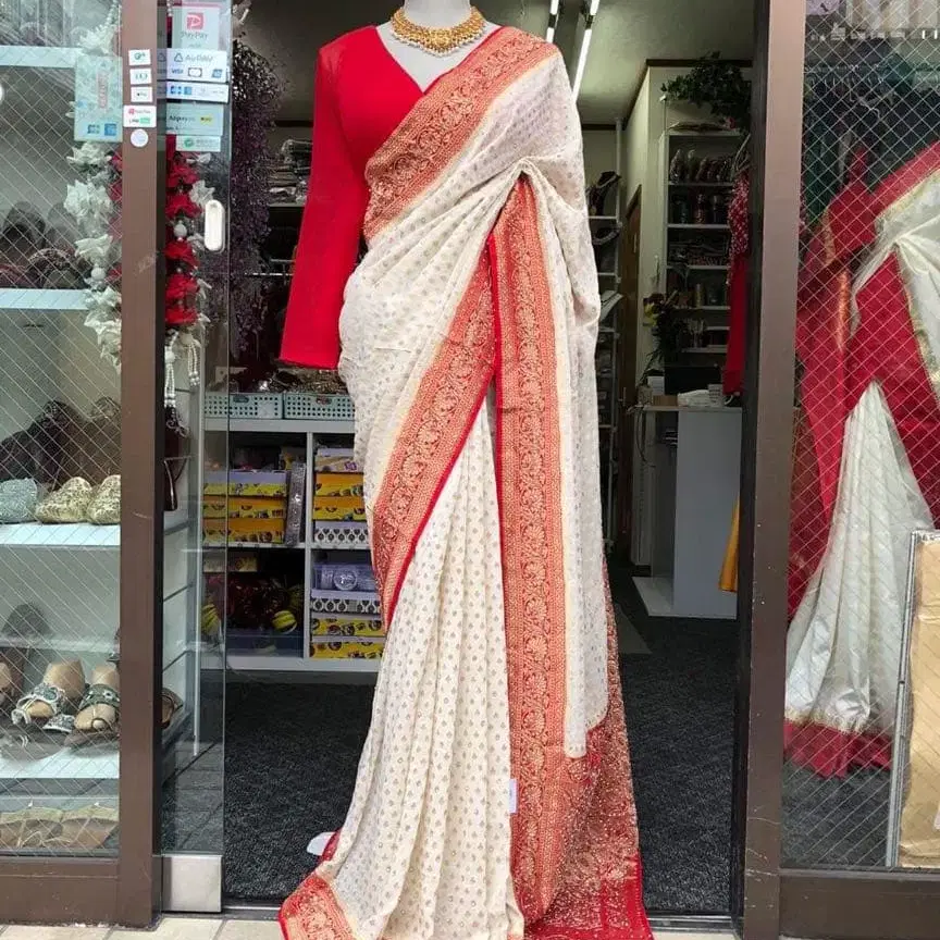 크림색과 빨간색 자수가 들어간 사리, 가벼운 원단으로 착용감 우수.