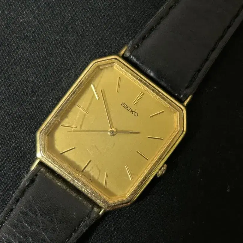골드 색상의 팔각형 케이스와 가죽 밴드의 심플한 디자인의 SEIKO 80년대 쿼츠 손목시계.