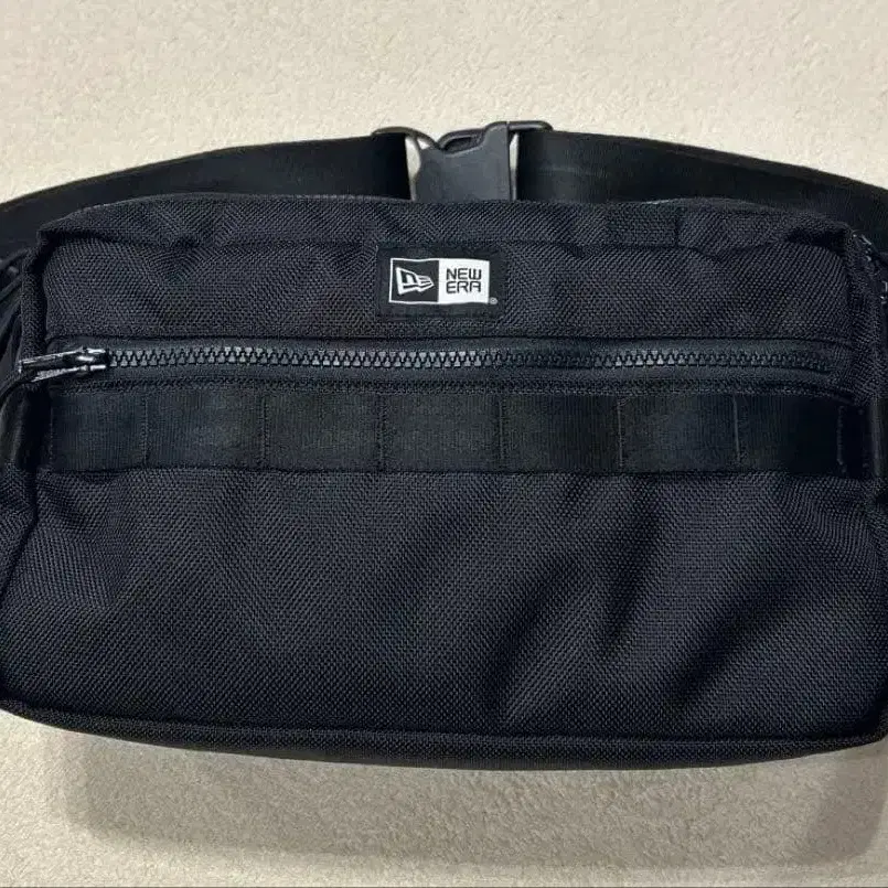 뉴에라 나일론 소재의 블랙 바디백, 플라스틱 버클 포함.