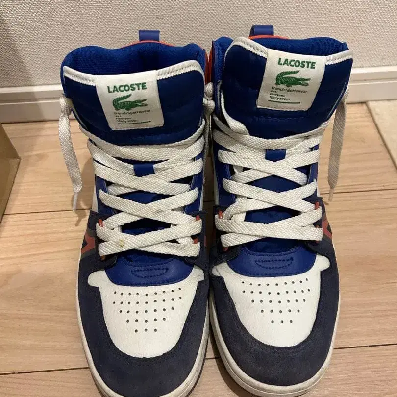 네이비와 화이트의 하이컷 스니커즈, 스웨이드와 합성 피혁의 콤비네이션. - 브랜드: LACOSTE - 색상: 네이비/화이트/오렌지 - 스타일: 하이컷 스니커즈 - 밑창 색상: 화이트 - 소재: 스웨이드/합성 피혁 - 디자인: 로고 패치 포함 - 신발끈 색상: 화이트 방문해 주셔서 감사합니다. 사이즈 - 사진으로 확인해 주세요. 얼룩 - 신발끈, 신발 밑창 가로에 얼룩 있음.