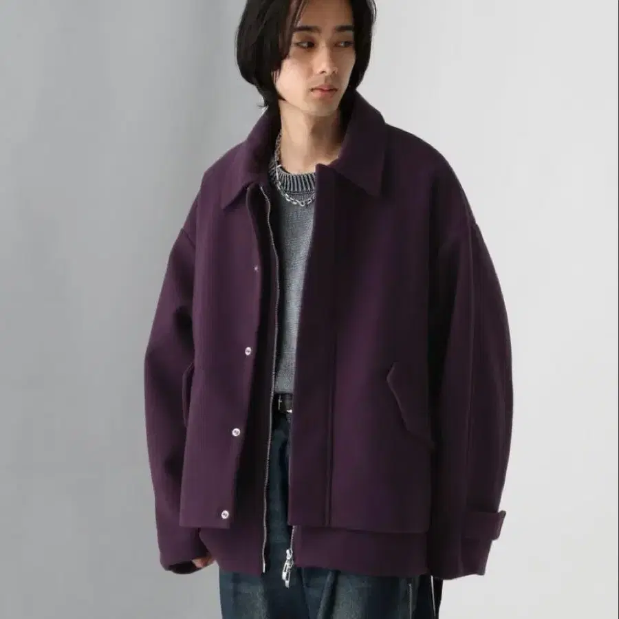자동 번역되었어요. 원문보기HARE의 오버 사이즈 퍼플 자켓, 두꺼운 원단으로 된 하이넥 디자인.
