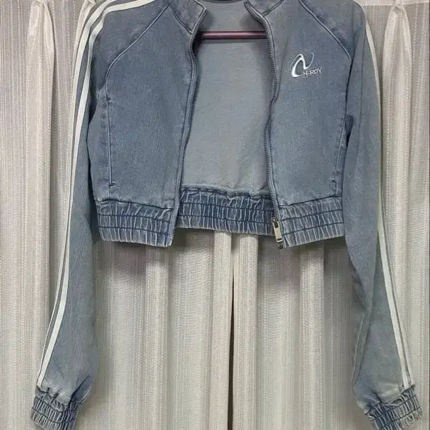 래글런 슬리브와 사이드 스트라이프가 특징인 라이트 블루 크롭 자켓.