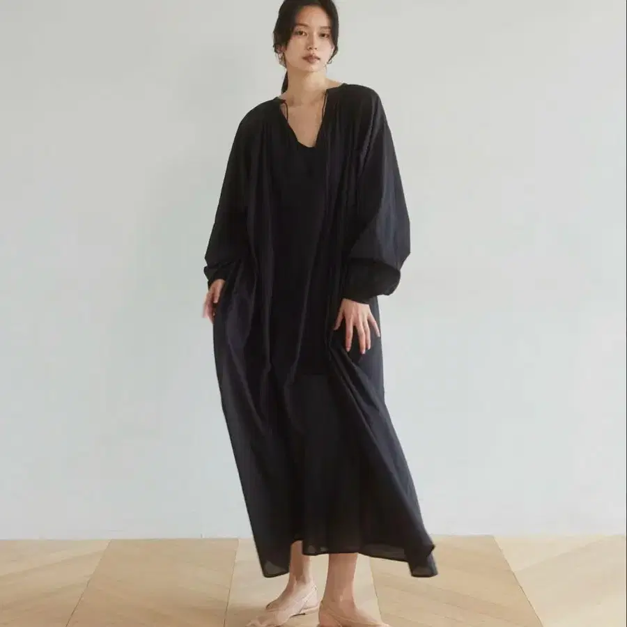 C/voile 에어리 볼륨 V컷 드레스 블랙 롱 원피스