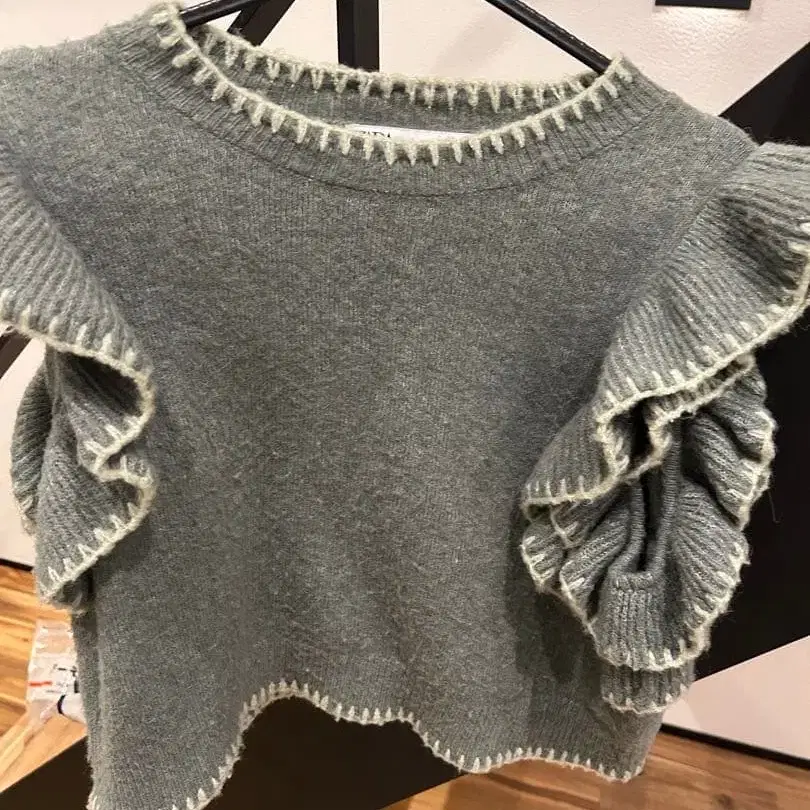 ZARA 프릴 니트 베스트 슬리브리스입니다. 사이즈는 m입니다. 약간의 보풀이 있습니다.