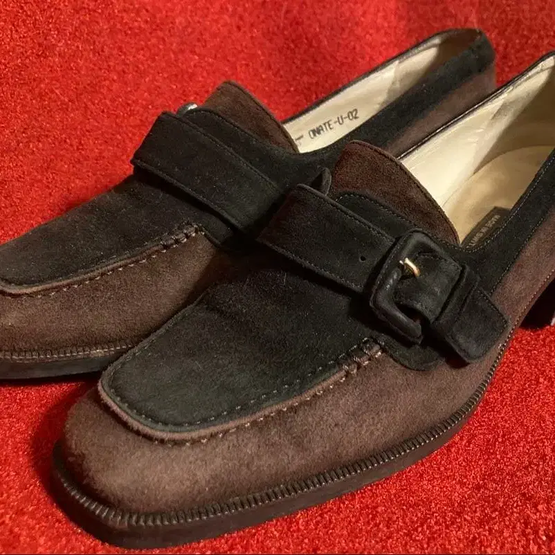 BALLY의 스웨이드 가죽 펌프스입니다. 브라운과 블랙의 콤비 색상에 귀여운 버클이 악센트로 달려 있습니다. 표기 사이즈는 US 6으로 약 23cm 정도입니다. 오래된 BALLY라 약간 모양이 망가진 부분이 있습니다. 전체적으로 사용감과 옆면에 얼룩이 있습니다. 중고품이므로 이해하시는 분은 잘 부탁드립니다.
