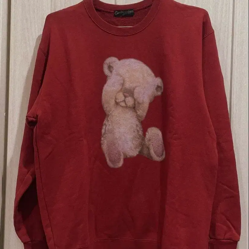 곰 프린트가 특징인 빨간색 긴팔 맨투맨.