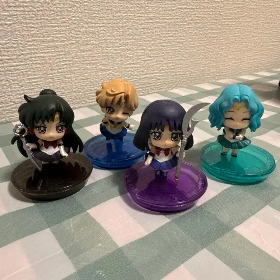 세일러문 SD 피규어 4개 세트, 컬러풀한 받침대 포함.