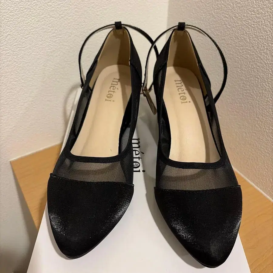 스트랩이 있어 걷기 편하며, 광택이 있는 패브릭 소재이며, 힐에는 미세한 라메가 붙어 있습니다.
