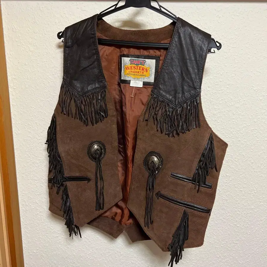 프린지가 달린 브라운 가죽 & 스웨이드 베스트, M 사이즈, 웨스턴 스타일에 최적.