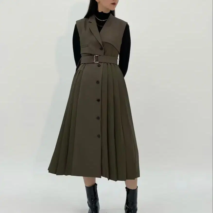 <디자인> 비대칭 테일러드 베스트를 입은 듯한 베스트 원피스. 사이드에는 소재를 달리한 플리츠가 걸을 때마다 움직임을 주는 디자인입니다. 허리 벨트 위치를 높게 설정하여 허리가 높아 보이고 시각적으로 깔끔하게 연출해 줍니다. 백 디자인에도 신경 써서 커팅 디테일을 넣어 레이어드 스타일링도 즐길 수 있습니다.