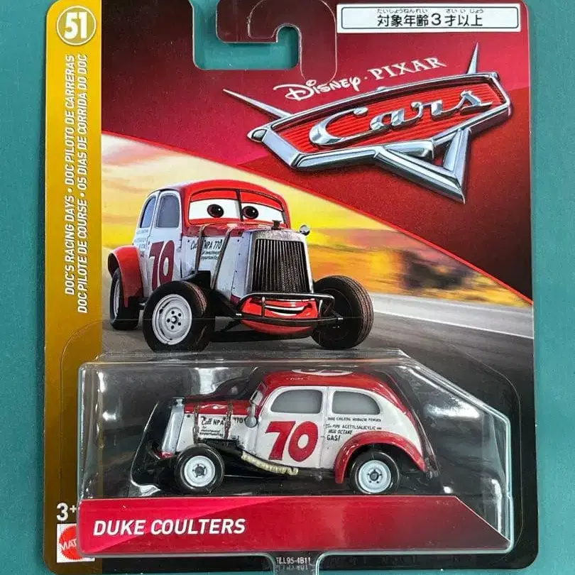 Disney Pixar Cars 시리즈의 DUKE COULTERS, 번호 51, 3세 이상 대상 미니카입니다.