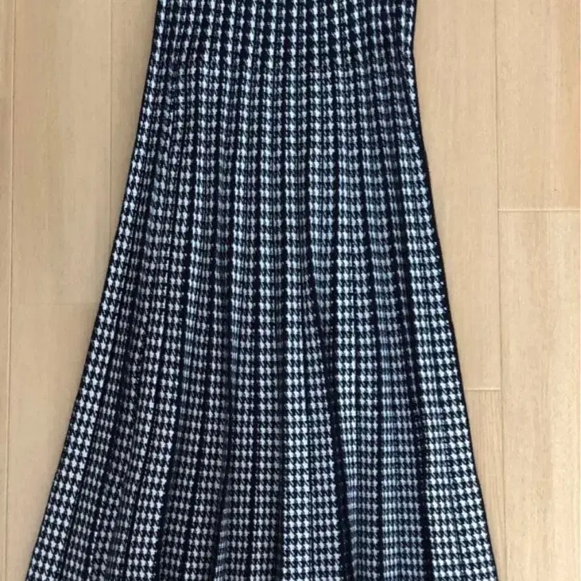 블랙과 화이트 체크 무늬의 롱 플리츠 스커트, 허리밴딩으로 쾌적한 착용감.