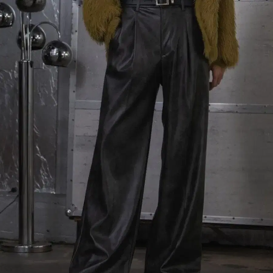ーーー셋업 가능 DABO 시리즈에서 나온 초와이드 가죽 팬츠ーーーpoint □ 초와이드 실루엣의 가죽 팬츠. □ 허리에 3개의 턱을 넣어 더욱 폭넓게 퍼지는 실루엣으로. □ [블랙]은 매끄럽고 표면감이 예쁜 검은색 무지. □ [블랙 계열 기타]는 얼룩감이 있는 가공을 더한 빈티지 느낌의 분위기.