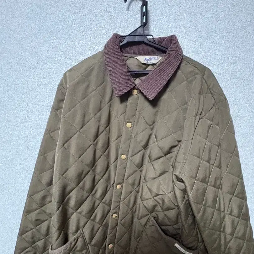 올리브 색상의 퀼팅 자켓, 코듀로이 옷깃과 앞면 포켓이 있습니다. - 색상: 올리브 - 소재: 퀼팅 - 브랜드: Backers - 옷깃 디자인: 코듀로이 옷깃 - 포켓: 앞면 포켓 있음 방문해 주셔서 감사합니다. 사이즈 - L
