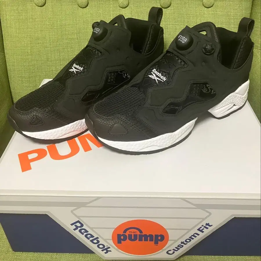 펌프 시스템이 탑재된 블랙 스니커즈.