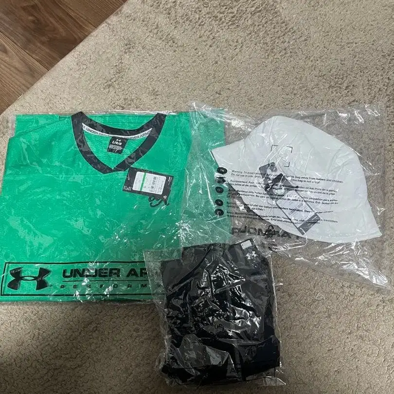 언더아머 3세트입니다. 화이트 모자 블랙 스패츠 그린 의류 사이즈감을 보기 위해 한 번 개봉했지만 미사용품입니다. 택도 있습니다. 질문 있으시면 잘 부탁드립니다.